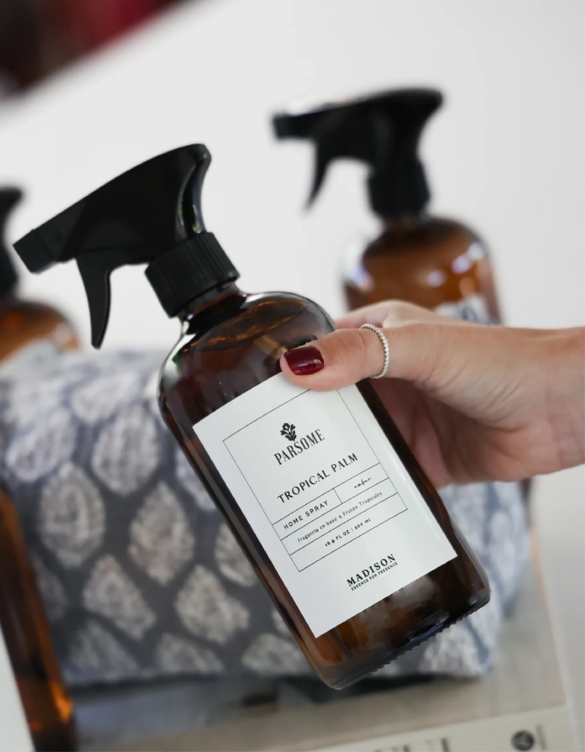 ¡Descubre el aroma Tropical Palm con nuestro nuevo Home Spray, resultado de la emocionante colaboración entre Madison y Parsome! Spray ambiental de intenso aroma y excelente fijación para ambientes, linos y telas. Puedes utilizarlo en cualquier rincón de tu casa, en la ropa de cama, cortinas y sillones. ¡Verás que rico queda en textiles! ¡Es el aroma que usa Parsome para sus prendas!